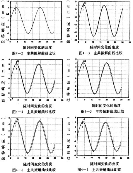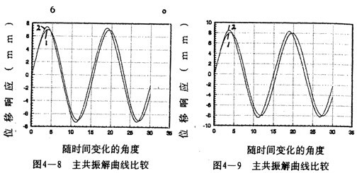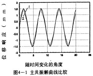 =2時(shí)兩者的重合性很好。(2).隨著振幅的增大,解析解曲線(xiàn)1和仿真解曲線(xiàn)2在相位上產(chǎn)生微小變化,解析解的相位超前仿真一個(gè)小量,原因是隨著振幅的增大,系統(tǒng)呈現(xiàn)更為強(qiáng)烈的非線(xiàn)性,而在推導(dǎo)中略去了高次項(xiàng),但還是可以滿(mǎn)足工程的要求。(3)從(4-78)-(4-85)式中的各δ值可知,在聯(lián)軸器產(chǎn)生主共振的情況下,激振力很小。