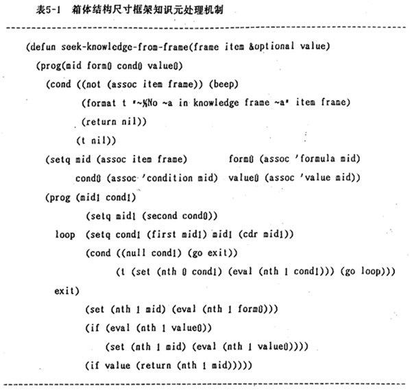 最后,測試取值條件(value)側(cè)面,若對(duì)取值有限制,則檢驗(yàn)所計(jì)算值是否滿足紅束條件;如對(duì)delta值的限制,若delta≤8,則取delta=8。對(duì)箱體知識(shí)的求值過程的LISP函數(shù)如表5-1:
