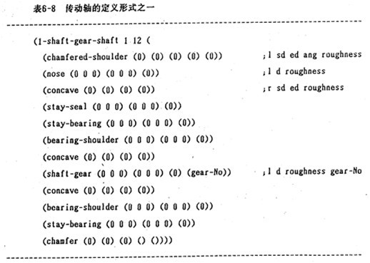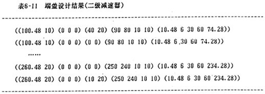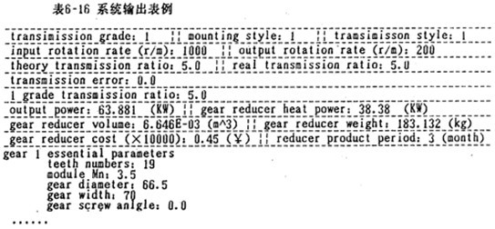 圓柱齒輪減速器設(shè)計(jì)完成后,其結(jié)果為一系列表(LISP 語(yǔ)言形式)組成的結(jié)果。為了使專家系統(tǒng)的結(jié)果方便地被用戶所理解,系統(tǒng)設(shè)置有相應(yīng)的輸出函數(shù),并以表格的形式,輸出所需的設(shè)計(jì)數(shù)據(jù)。下表(表6-16 )為專家系統(tǒng)設(shè)計(jì)的一一級(jí)圓柱齒輪減速器的示例。