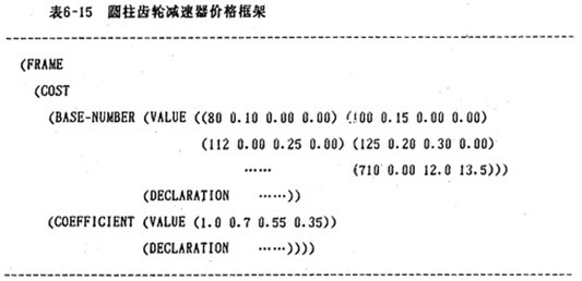 1.圓柱齒輪減速器價(jià)格主要考慮齒輪材料、精度,減速器中心距,總重量等因素,如表6-14。專家系統(tǒng)設(shè)計(jì)中,可用框架表示(表6-15 ):