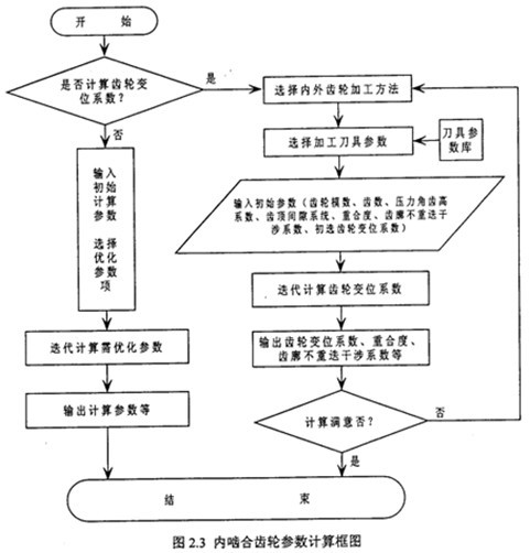 在少齒差內(nèi)嚙合傳動中,變位系數(shù)的確定是設(shè)計的關(guān)鍵。齒輪的實際幾何尺寸與齒輪的加工方法有直接的關(guān)系,所以用不同的齒輪加工方法的計算公式來推導(dǎo)變位系數(shù)的迭代公式,所得迭代結(jié)果不一樣。內(nèi)嚙合齒輪參數(shù)計算模塊中,已經(jīng)由公式(2.5 )~(2.9 )推導(dǎo)了少齒差內(nèi)嚙合傳動的各種實際加工情況下的變位系數(shù)的計算迭代公式,圖(2.3)為齒輪變位系數(shù)計算框圖。