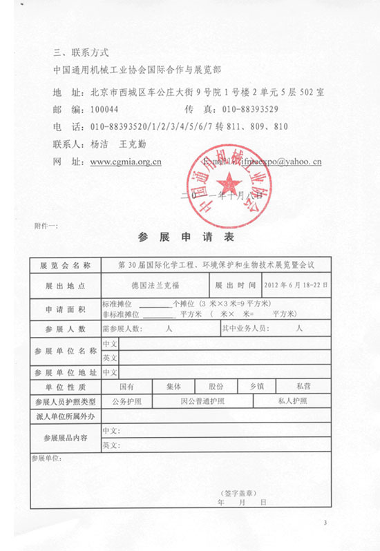 參展方式:預(yù)參展會(huì)員企業(yè)于2011年10月31日前向各專業(yè)分會(huì)報(bào)名并說明參展面積;總會(huì)統(tǒng)計(jì)參展商人數(shù)及參展面積后,向阿赫瑪展會(huì)主辦方申請參展總面積,待主辦方確認(rèn)面積及價(jià)格后,向各參展商通報(bào)最終展位價(jià)格并與之共同協(xié)商展位分布�!秴⒄股暾埍怼芬姼郊�。