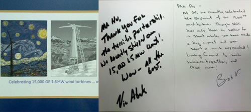 GE慶祝第15000臺1.5MW風(fēng)機時寫給南高齒董事長兼總經(jīng)理胡曰明先生的信