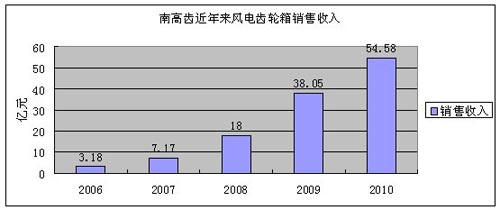 2010年南高齒實現(xiàn)銷售收入73.93億元,較2009年56.47億元增長30.9%。其中風(fēng)電齒輪箱繼續(xù)保持高速增長態(tài)勢,全年實現(xiàn)銷售 收入54.58億元,較2009年大幅增長43.4%,2009年風(fēng)電齒輪箱銷售收入為38.05億元。