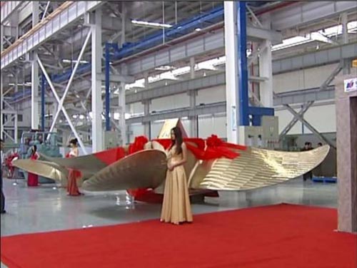 了快速地發(fā)展,產(chǎn)品深得海內(nèi)外客戶的信賴,公司已累計(jì)生產(chǎn)固定槳3000 余件、可調(diào)槳600余套。2009 年8 月28 日,中國(guó)傳動(dòng)戰(zhàn)略投資同舟,技改投入2.55 億元。自去年底新廠區(qū)試生產(chǎn)至今已累計(jì)交付47500DWT、82000DWT、176000DWT 配套的螺旋槳產(chǎn)品10 余套。