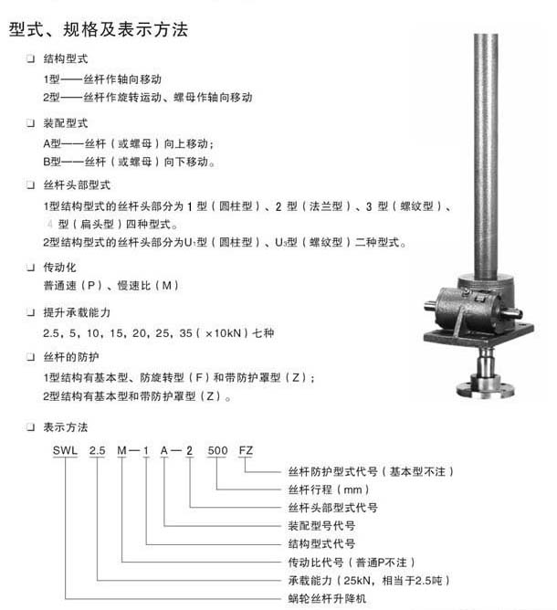絲杠升降機廣泛應(yīng)用于機械、冶金、建筑、水利設(shè)備等行業(yè),具有起升、下降及借助輔件推進、翻轉(zhuǎn)及各種高度位置調(diào)整等諸多功能.SWL蝸輪絲杠升降機是一種基礎(chǔ)起重部件,具有結(jié)構(gòu)緊湊、體積小、重量輕、動力源廣泛、無噪音、安裝方便、使用靈活、功能多、配套形式多、可靠性高、使用壽命長等許多優(yōu)點�?梢詥闻_或組合使用,能按一定程序準確地控制調(diào)整提升或推進的高度,可以用電動機或 其他動力直接帶動,也可以手動。它有不同的結(jié)構(gòu)形式和裝配形式,且提升高度可按用戶的要求定制。 。該裝置可以自鎖
