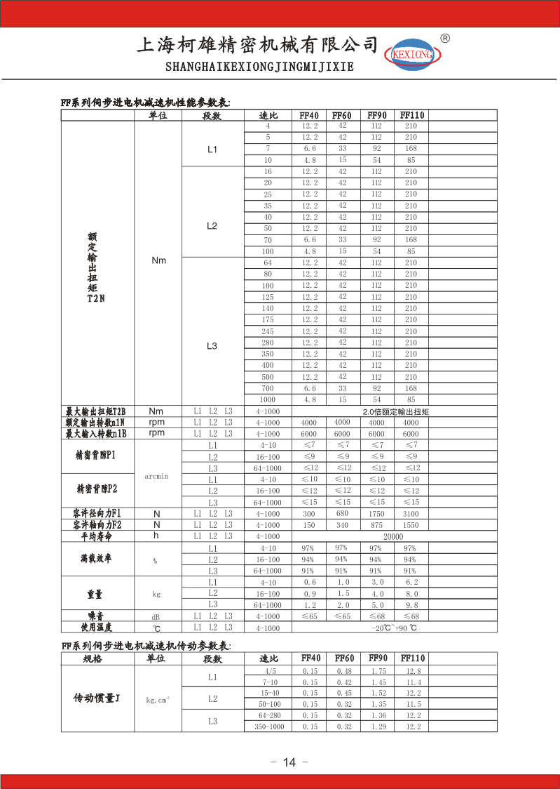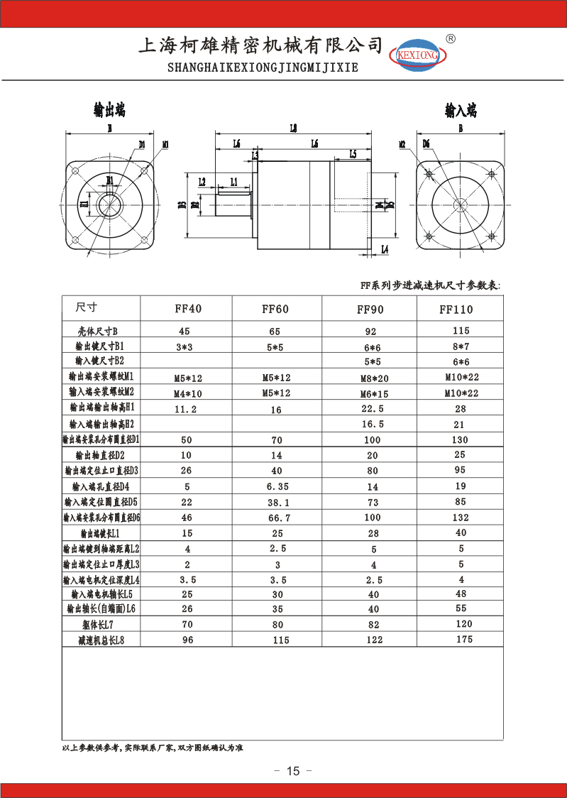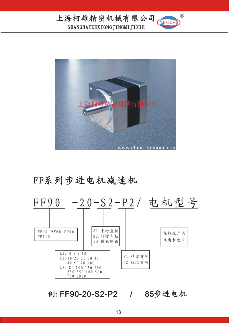 FF系列步進(jìn)電機(jī)減速機(jī):FF40、FF60、FF90、FF110、同軸式機(jī)座型號,速比:3-1000有20多個(gè)比速可選擇;分一、二、三級減速傳動(dòng);精度:一級傳動(dòng)精度在8-10弧分,二級傳動(dòng)精度在6-8弧分,三級傳動(dòng)精度7-10弧分;等一千多種規(guī)格。