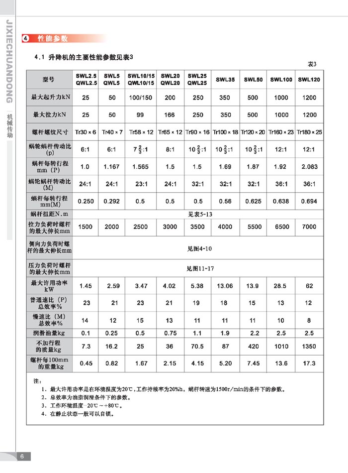 QWL系列蝸輪絲桿升降機(jī)是一種基礎(chǔ)起重部件,已列為JB/ZQ4391-86標(biāo)準(zhǔn)。承載能力2.5-120T。具有結(jié)構(gòu)緊湊,體積小,重量輕,動(dòng)力源廣泛。無(wú)噪音,安裝方便,使用靈活,功能多。配套形式多,可靠性高,使用壽命長(zhǎng)等許多優(yōu)點(diǎn)。具有提升、降落、推進(jìn)、翻轉(zhuǎn)等多種功能�?蓡闻_(tái)也可組合使用,可能用電動(dòng)機(jī)或其他動(dòng)力直接帶動(dòng),也可手動(dòng)。有不同的結(jié)構(gòu)型式和裝配方式,提升高度可按用戶的要求制造,該裝置可以自鎖。