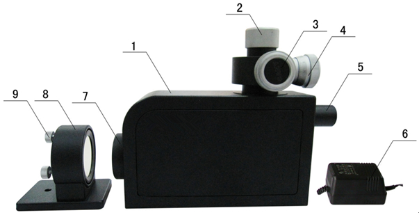 6、變壓器 7、望遠(yuǎn)物鏡 8、可調(diào)式反射鏡 9、調(diào)節(jié)螺釘