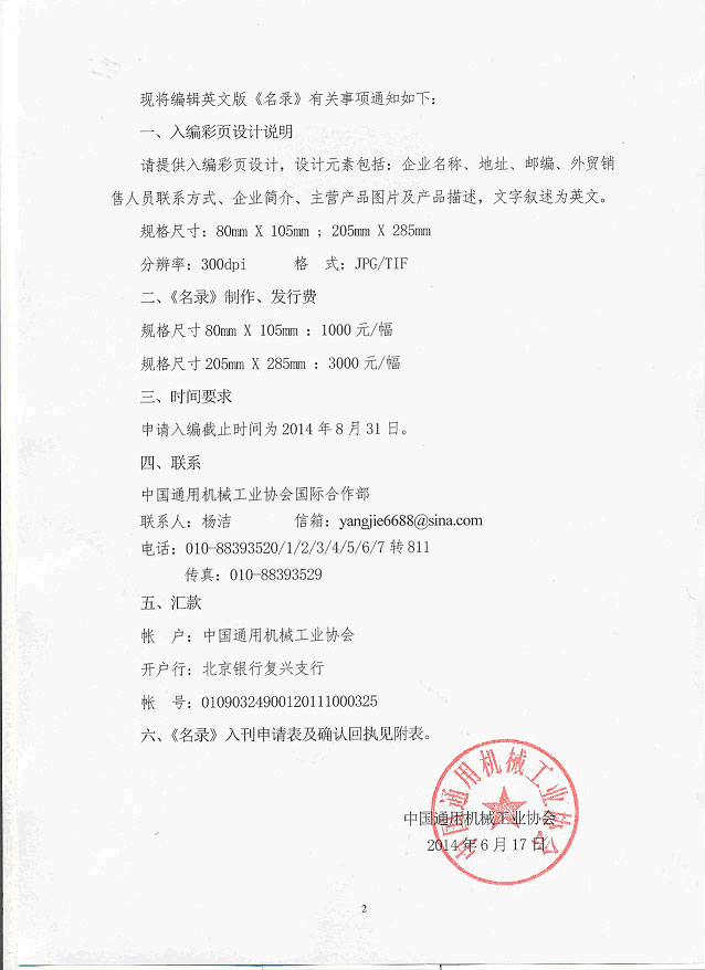 上述申請(qǐng)經(jīng)中國(guó)通用機(jī)械工業(yè)協(xié)會(huì)確認(rèn),即具合同效力,雙方必須履行其有關(guān)責(zé)任和義務(wù)。請(qǐng)收到確認(rèn)回執(zhí)后即將《名錄》制作發(fā)行費(fèi)匯入指定帳戶。
