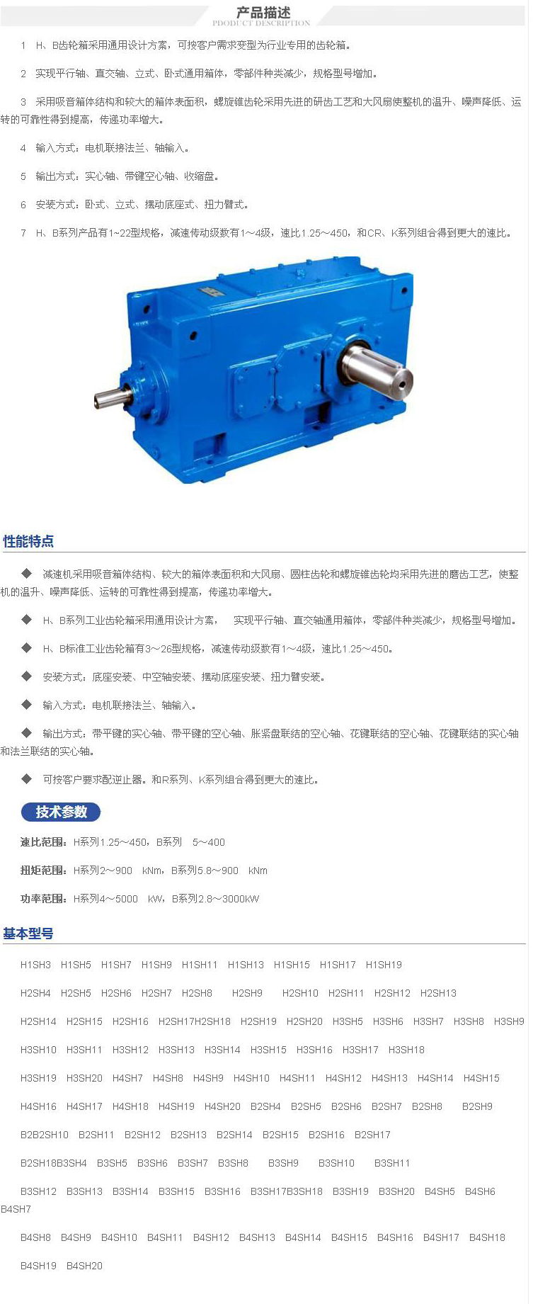 ◆ H、B系列工業(yè)齒輪箱采用通用設(shè)計方案, 實現(xiàn)平行軸、直交軸通用箱體,零部件種類減少,規(guī)格型號增加。