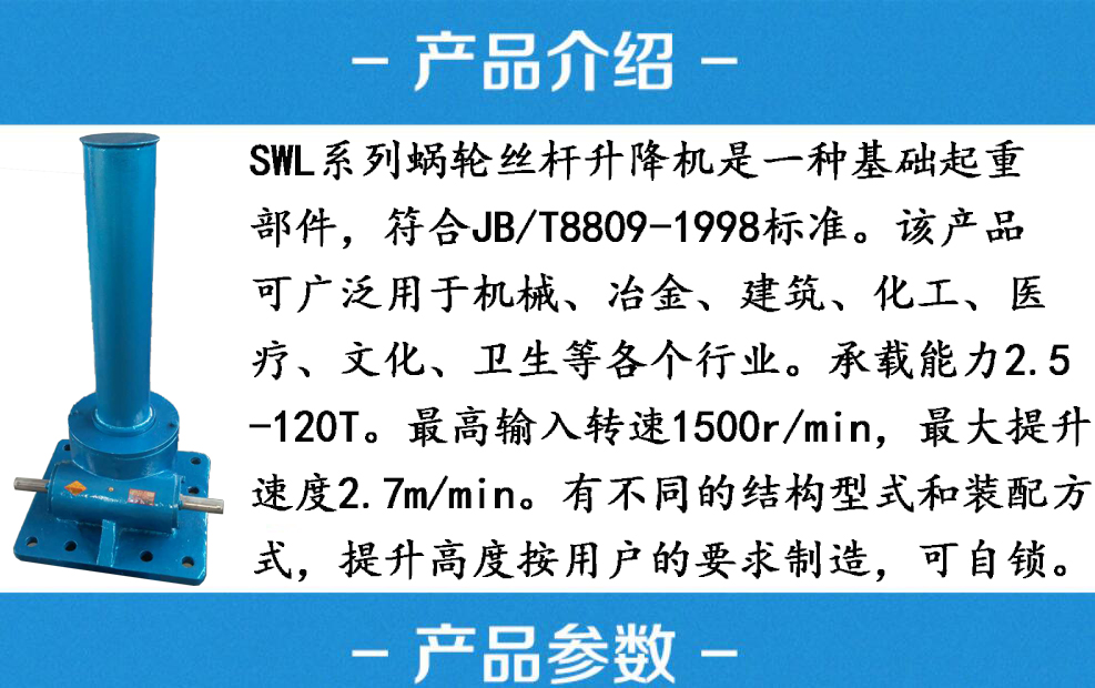 SL系列蝸輪絲桿升降機是一種基礎起重部件,符合JB/T8809-1998(原JB/Z04391-86)標準。該產可廣泛用于機械、冶金、建筑、化工、醫(yī)療文化衛(wèi)生等各個行業(yè)。承載能力2.5—120T。具有結構緊湊、積小、重量輕、動力源廣泛、無噪音、安裝方便、使用靈活、功能多、配套形式多、可靠性高、使用壽命長許多優(yōu)點。具有提升、降落、推進、翻轉等多種功能,可以單臺或組合使用,能按一定程序準確地控制調整升或推進的高度,可以用電動機或其它動力直接帶動,也可以手動。最高輸入轉速1500r/min,最大提升速2.7m/min。有不同的結構型式和裝配方式,提升高度按用戶的要求制造。該裝置可以自鎖。
