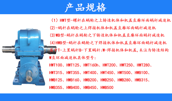 (4)HWB型-蝸桿在蝸輪之下焊接機(jī)體和機(jī)蓋直廓環(huán)面蝸桿減速機(jī)其中T-上置蝸桿B-下置蝸桿:W-焊接機(jī)體和機(jī)蓋,未注為鑄造結(jié)構(gòu)W直環(huán)面減速機(jī)具體型號:HWT100、HWT125、HWT160、HTW200、HWT250、HWT280、HWT255、HWB400、HWB450、HWB500
