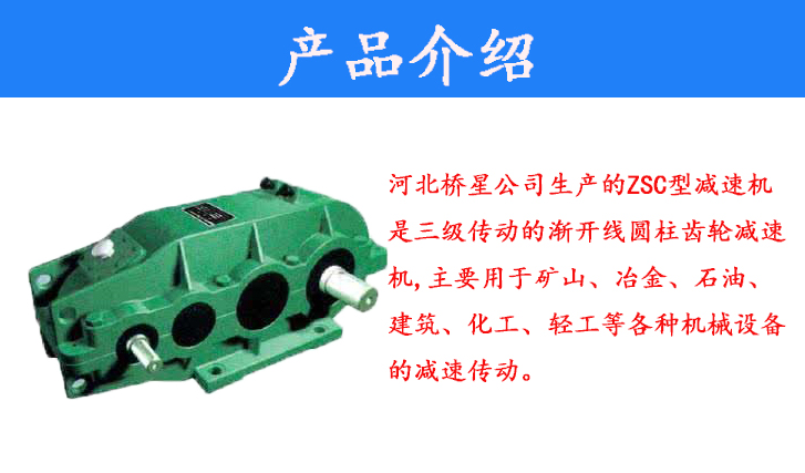 河北橋星公司生產(chǎn)的ZSC型減速機(jī)是三級傳動的漸開線圓柱齒輪減速機(jī),主要用于礦山、冶金、石油、建筑、化工、輕工等各種機(jī)械設(shè)備的減速傳動。