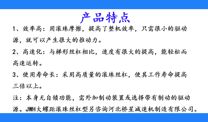 1、效率高:用滾珠摩擦、提高了整機(jī)效率,只需很小的驅(qū)動(dòng)源,就可以產(chǎn)生很大的推動(dòng)力。