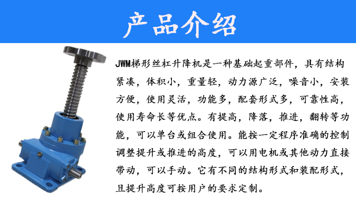 JWM梯形絲杠升降機是一種基礎(chǔ)起重部件,具有結(jié)構(gòu)緊湊、體積小、重量輕、動力源廣泛、無噪音、安裝方便、使用靈活、功能多、配套形式多、可靠性高、使用壽命長等許多優(yōu)點�?梢詥闻_或組合使用,能按一定程序準確地控制調(diào)整提升或推進的高度,也可以用電動機或其它動力直接帶動,也可以手動。它有不同的結(jié)構(gòu)形式和裝配形式,且提升高度可按用戶的要求定制。