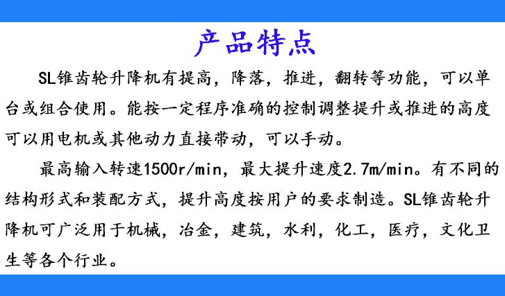 SL錐齒輪升降機可廣泛用于機械、冶金、建筑、水利、化工、醫(yī)療文化衛(wèi)生等各個行業(yè)。