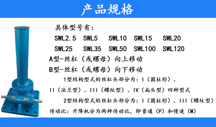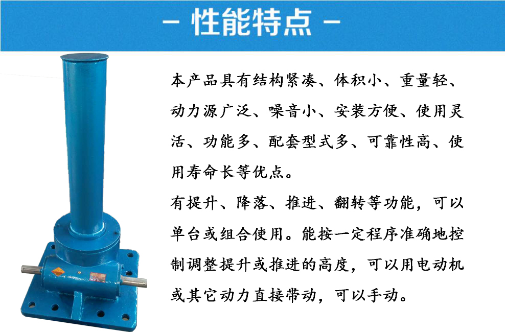 承載能力2.5—120T。具有結(jié)構(gòu)緊湊、積小、重量輕、動力源廣泛、無噪音、安裝方便、使用靈活、功能多、配套形式多、可靠性高、使用壽命長許多優(yōu)點。具有提升、降落、推進、翻轉(zhuǎn)等多種功能,可以單臺或組合使用,能按一定程序準(zhǔn)確地控制調(diào)整升或推進的高度,可以用電動機或其它動力直接帶動,也可以手動。最高輸入轉(zhuǎn)速1500r/min,最大提升速2.7m/min。有不同的結(jié)構(gòu)型式和裝配方式,提升高度按用戶的要求制造。該裝置可以自鎖。