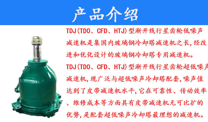 TDU(TDO、CFD、HTJ)型漸開線行星齒輪低噪聲減速機(jī)是集國(guó)內(nèi)玻璃鋼冷卻塔減速機(jī)之長(zhǎng),經(jīng)改進(jìn)和優(yōu)化設(shè)計(jì)的玻璃鋼冷卻塔專用減速機(jī)。TD(TDO、CFD、HTJ型漸開線行星齒輪超低噪聲減速機(jī),現(xiàn)廣泛與超低噪聲冷卻塔配套,噪聲值達(dá)到了皮帶減速機(jī)水平,它在可靠性、傳動(dòng)效率、維修成本等方面具有皮帶減速機(jī)無可比擴(kuò)的優(yōu)勢(shì),是配套超低噪聲冷卻塔最理想的減速機(jī)。