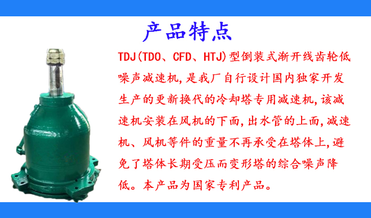 TDJ(TDO、CFD、HTJ)型倒裝式漸開線齒輪低噪聲減速機(jī),是我廠自行設(shè)計(jì)國(guó)內(nèi)獨(dú)家開發(fā)生產(chǎn)的更新?lián)Q代的冷卻塔專用減速機(jī),該減速機(jī)安裝在風(fēng)機(jī)的下面,出水管的上面,減速機(jī)、風(fēng)機(jī)等件的重量不再承受在塔體上,避免了塔體長(zhǎng)期受壓而變形塔的綜合噪聲降低。本產(chǎn)品為國(guó)家專利產(chǎn)品。
