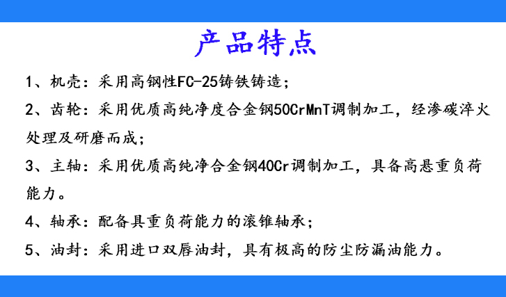 2、齒輪:采用優(yōu)質(zhì)高純凈度合金鋼50CrnT調(diào)質(zhì)加工,經(jīng)滲碳淬火處理及研磨而成