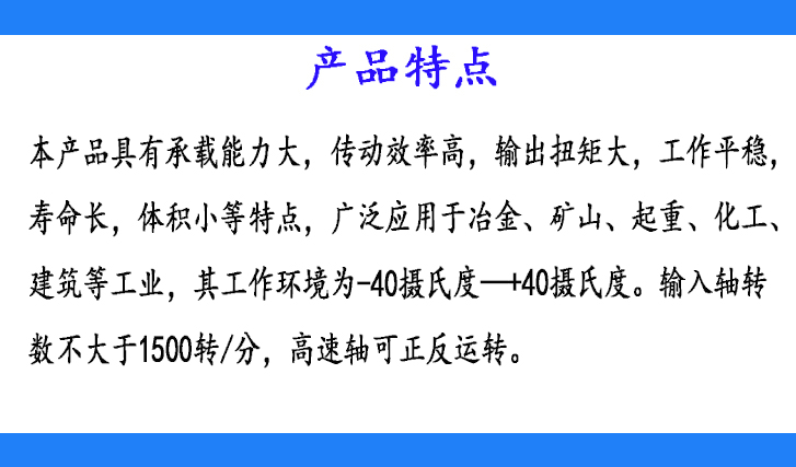 本產(chǎn)品具有承載能力大,傳動效率高,輸出扭矩大,工作平穩(wěn),壽命長,體積小等特點,廣泛應用于冶金、礦山、起重、化工建筑等行業(yè),其工作環(huán)境為-40℃-+40℃。輸入軸轉(zhuǎn)數(shù)不大于1500轉(zhuǎn)/分,高速軸可正反運轉(zhuǎn)。