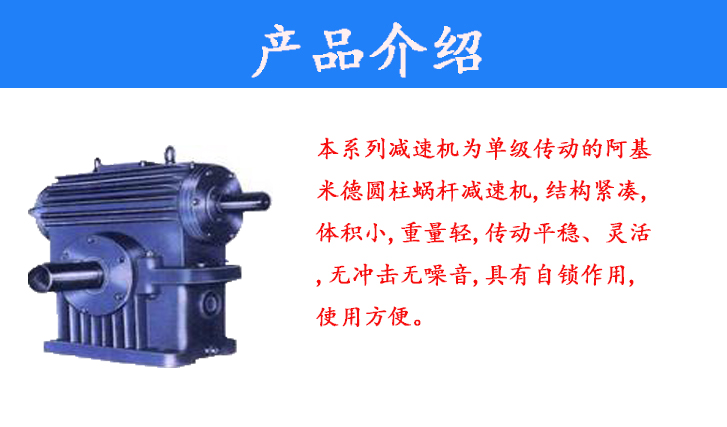 本系列減速機為單級傳動的阿基米德圓柱蝸桿減速機,結(jié)構(gòu)緊湊,體積小,重量輕,傳動平穩(wěn)、靈活,無沖擊無噪音,具有自鎖作用,使用方便。