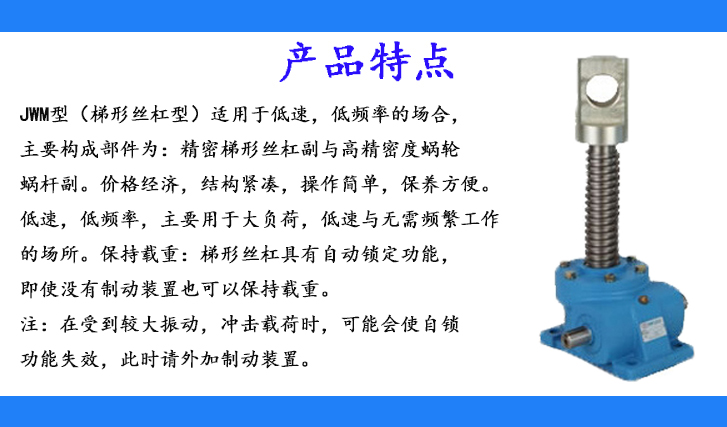 1、JWM型(梯形絲杠型)適用于低速、低頻率的場合,主要構(gòu)成部件為:精密梯形絲杠副與高精密度蝸輪蝸桿副。