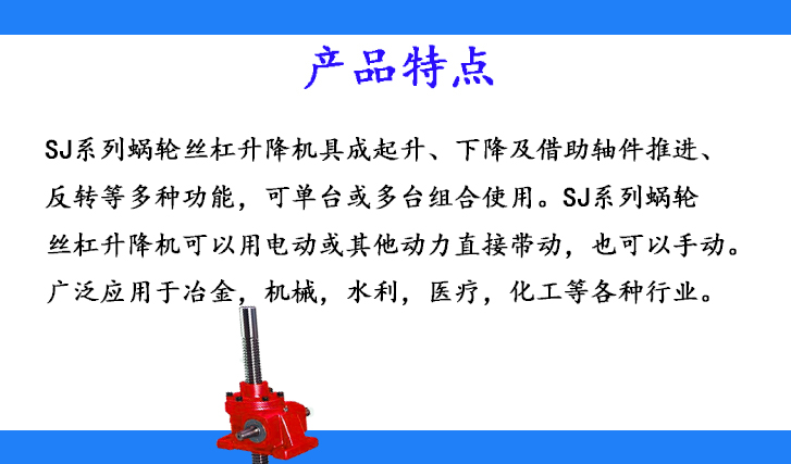 SJ系列蝸輪絲杠升降機具成起升、下降及借助軸件推進、反轉(zhuǎn)等多種功能,可單臺或多臺組合使用。