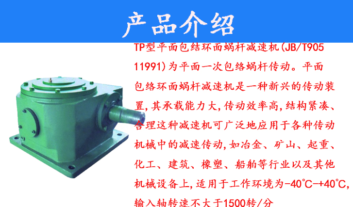 TP型平面包結(jié)環(huán)面蝸桿減速機(jī)(JB/T90511991)為平面一次包絡(luò)蝸桿傳動。平面包絡(luò)環(huán)面蝸桿減速機(jī)是一種新興的傳動裝置,其承載能力大,傳動效率高,結(jié)構(gòu)緊湊、合理這種減速機(jī)可廣泛地應(yīng)用于各種傳動機(jī)械中的減速傳動,如冶金、礦山、起重、化工、建筑、橡塑、船舶等行業(yè)以及其他機(jī)械設(shè)備上,適用于工作環(huán)境為-40℃-+40℃,輸入軸轉(zhuǎn)速不大于1500轉(zhuǎn)/分