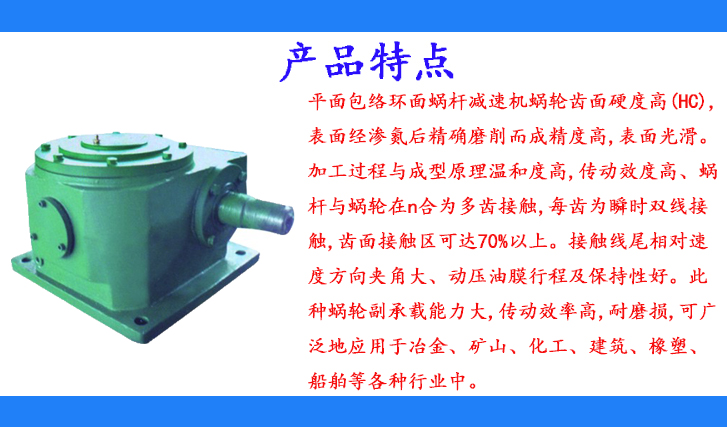 平面包絡(luò)環(huán)面蝸桿減速機(jī)蝸輪齒面硬度高(HC),表面經(jīng)滲氮后精確磨削而成精度高,表面光滑。加工過程與成型原理溫和度高,傳動效度高、蝸桿與蝸輪在n合為多齒接觸,每齒為瞬時(shí)雙線接觸,齒面接觸區(qū)可達(dá)70%以上。接觸線尾相對速度方向夾角大、動壓油膜行程及保持性好。此種蝸輪副承載能力大,傳動效率高,耐磨損,可廣泛地應(yīng)用于冶金、礦山、化工、建筑、橡塑、船舶等各種行業(yè)中。