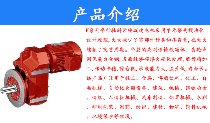 F系列平行軸斜齒輪減速電機(jī)采用單元架構(gòu)模塊化設(shè)計(jì)原理,大大減少了零部件種類和庫存量,也大大縮短了交貨周期。帶筋的高剛性鑄鐵箱體、齒輪采用優(yōu)質(zhì)臺(tái)金鋼,表面經(jīng)滲碳淬火硬化處理,磨齒精加工,傳動(dòng)平穩(wěn),噪音低,承載能力大,溫升低,壽命長(zhǎng)。該產(chǎn)品廣泛用于輕工、食品、啤酒飲料、化工、自動(dòng)扶梯、自動(dòng)化倉儲(chǔ)設(shè)備、建筑、機(jī)械、鋼鐵冶金、造紙、人造板機(jī)械、汽車制造、煙草機(jī)械、水利、印刷包裝、制藥、紡織、建材、物流、飼料機(jī)械、環(huán)境保護(hù)等領(lǐng)域。