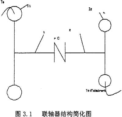 為了便于求解運(yùn)動(dòng)微分方程,需要對(duì)傳動(dòng)軸系中聯(lián)軸器的主動(dòng)和從動(dòng)兩側(cè)的轉(zhuǎn)動(dòng)慣量和剛度作力學(xué)模型的簡(jiǎn)化。根據(jù)具體結(jié)構(gòu)情況,可以將軸系簡(jiǎn)化為若干個(gè)等效轉(zhuǎn)動(dòng)慣量圓盤,以具有某一剛度的周聯(lián)系起來。通常比較典型的是簡(jiǎn)化為兩個(gè)等效的圓盤,配置在聯(lián)軸器的兩側(cè)。并設(shè)定所聯(lián)兩軸的剛性很大,只有聯(lián)軸器具有彈性和阻尼。如圖3.1所示