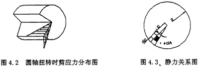 ρ與該點到原新的距離ρ成正比。因為Yρ發(fā)生于垂直于半徑的平面內,所以Yρ也與半徑垂直。如果注意到剪應力互等定理,則在縱向截面和橫截面上,沿半徑剪應力的分布如圖4.2所示