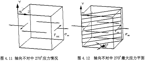 此時(shí)的受力由圖上可以看出,屬于空間應(yīng)力狀態(tài),其基本分析過(guò)程類似于徑向不對(duì)中900狀態(tài),現(xiàn)在將徑向不對(duì)中2700時(shí)的受力情況:σxx=0,σyy=0,σzz=0,τxy=-τrot,σyz=0,σzx=0,σzx=τrod分別代入式(4-29)(4-30)(4-31),得到
