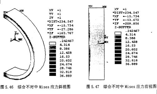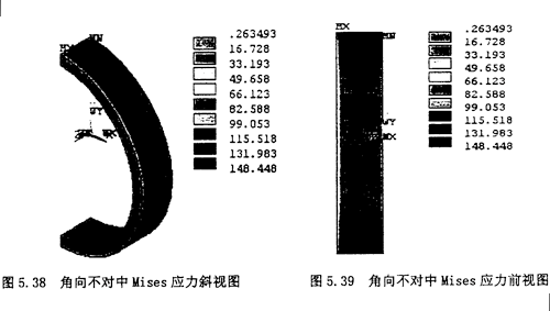 2.顯示節(jié)點的Von Mises應(yīng)力云圖:選擇Main Menu>General Postproc>Plot Result>NodalSolu,在彈出的對話框內(nèi)選擇“Stress”,第二欄內(nèi)選擇“Von Mises Stress”,則其顯示的云圖如圖5,38,5.39所示