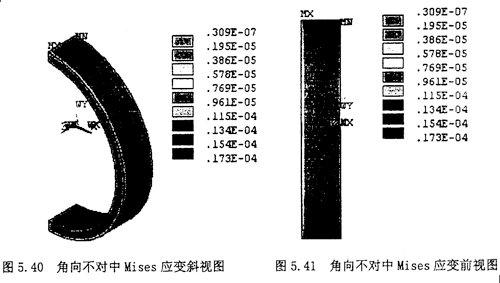 3.顯示節(jié)點的Von Mises應(yīng)變云圖:選擇Main Menu>General Postproc>Plot Result>NodalSolu,在彈出的對話框內(nèi)選擇“Strain”,第二欄內(nèi)選擇“Von Mises Strain”,則其顯示的云圖如圖5.40,5.41所示