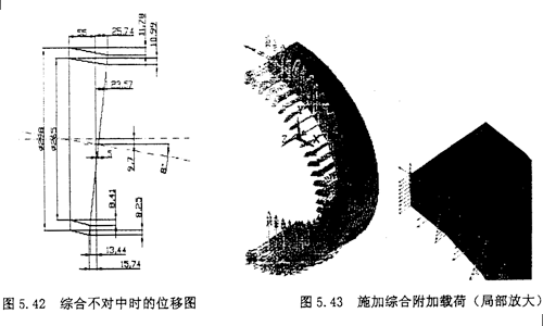 重復(fù)5.4.2節(jié)中的(1),(2),(3),(4),(5),(6)步驟。然后開始施加綜合的附加載荷。由于綜合位移使得橡膠圓環(huán)附加的徑向拉應(yīng)力σax,附加的剪應(yīng)力τrad,附加的角向應(yīng)力τrad,以及由橡膠圓環(huán)旋轉(zhuǎn)扭矩產(chǎn)生的剪應(yīng)力τrot。所以綜合不對中的應(yīng)力情況應(yīng)該是σax、τrad、τrad與τrot的疊加。施加綜合附加載荷后的圖形圖5.43所示。
