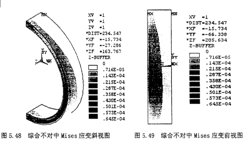3.顯示節(jié)點的Von Mises應(yīng)變云圖:選擇Main Menu>General Postproc>Plot Result>NodalSolu,在彈出的對話框內(nèi)選擇“Strain”,第二欄內(nèi)選擇“Von Mises Strain”,則其顯示的云圖如圖5.48,5.49所示