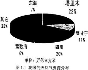 我國(guó)天然氣總資源量為3.8×1013m3。其中在面積為560,000km2的塔里木盆地,天然氣資源量就達(dá)8.39×l012m3。其中累計(jì)已探明地質(zhì)儲(chǔ)量4.19×l011m3,剩余可采儲(chǔ)量2.79×l011m3,是國(guó)內(nèi)天然氣資源量及剩余可采儲(chǔ)量最豐富的氣區(qū)。預(yù)計(jì)今后五至十年,累計(jì)探明地質(zhì)儲(chǔ)量可達(dá)1×1012m3。此外,從圖1-1可以看到,陜西、四川、青海等地的天然氣儲(chǔ)量也都十分可觀,氣田分布的西傾狀況比較明顯。