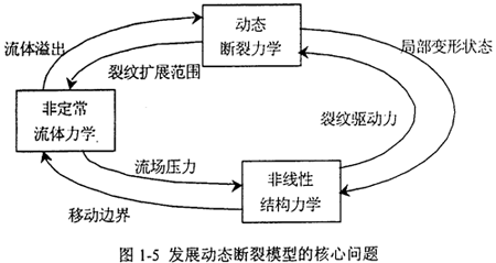 裂紋動(dòng)態(tài)擴(kuò)展與止裂問題涉及的是流體/結(jié)構(gòu)/斷裂相互作用又相互影響的過程,如圖1-5所示。流體/結(jié)構(gòu)/斷裂耦合作用下的動(dòng)態(tài)裂紋擴(kuò)展包括計(jì)算結(jié)構(gòu)力學(xué)、流體力學(xué)和斷裂力學(xué)等相關(guān)學(xué)科的綜合:
