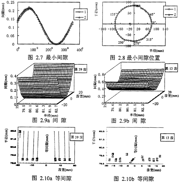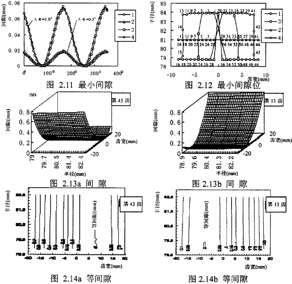 不失一般性設(shè)內(nèi)齒輪為主動輪外齒輪相對內(nèi)齒輪徑向位移Δx=-0.2mm,Δy=0.無載荷的情況下計算結(jié)果:圖2.7是內(nèi)齒旋轉(zhuǎn)一周時任意一對齒的最小間隙的變化或在任意的轉(zhuǎn)角0下各齒對的最小間隙。2.8 圖是半徑方向最小間隙所在的位置,由于外齒是鼓形齒且沒有偏角,在無載荷的情況下只在齒輪的中央齒廓處嚙合所以僅畫出半徑方向最小間隙位置。圖2.7 曲線1 是用本章方法計算的結(jié)果,曲線2 是用Heinz 幾何方法計算的結(jié)果,我們可以看出用兩種方法計算最小間隙的大小非常一致,但位置不同圖2.8 ,因為Heinz 方法僅規(guī)定內(nèi)外齒在分度圓上嚙合,本文是從全齒高嚙合狀態(tài)來考慮最小間隙及其位置的。圖2.7中250° 近間隙為零,即在無載荷或輕載荷時內(nèi)外齒輪在此處附近的對齒嚙合,相應(yīng)圖2.8 在250°嚙合處的縱坐標(biāo)大致為基圓的半徑,即嚙合線與基圓相切并與△x 位移線平行,這與前面所說與零齒差齒輪嚙合相似;圖2.9, 2.10 是在θ=0時第39 齒(圖a)和第13齒(圖b)的齒面間隙和等間隙曲線,從圖中可以看出最小間隙在齒寬的中央,這是因內(nèi)外齒沒有發(fā)生相對轉(zhuǎn)角位移,而且間隙沿齒高方向間隙變化的梯度小,即分度圓上的間隙與齒高方向的間隙相關(guān)很小,而沿著齒輪軸向的間隙變化的梯度較大,等間隙曲線沿軸向分布呈帶狀,這也是Heinz和本文計算最小間隙大小相近的原因。