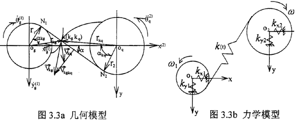 在以往對(duì)外齒輪模型簡(jiǎn)化時(shí)主要采用兩種方法如圖3.3a、3.3b幾何模型和力學(xué)模型。在幾何耦合模型中,齒輪輪齒被視為剛體。假定:1.嚙合過(guò)程中輪齒始終保持接觸,不脫嚙。2.嚙合線(xiàn)方向保持不變。要滿(mǎn)足假設(shè)1,按兩齒輪接觸表面法向速度相等原則: