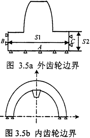 對(duì)于外齒輪Daimler-Benz公司選取邊界的方法是先取半個(gè)齒輪進(jìn)行有限無(wú)計(jì)算,這是從整體來(lái)考慮問(wèn)題,然后根據(jù)計(jì)算的結(jié)果來(lái)選擇邊界的范圍,其所定的邊界寬度如圖3.5a,S1=6.1m,m是齒輪的模數(shù)。Chaber所取的邊界的方法是考慮圣維需原理,其所定的邊界深度為S2=1.5m。綜合以上兩者的研究,用有限無(wú)計(jì)算外齒的變形,計(jì)算模型的邊界范圍可�。�