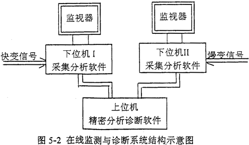 為了適應(yīng)日益更新的生產(chǎn)實(shí)際多種類型參數(shù)監(jiān)測和故障診斷的要求,建立由多臺微機(jī)并行運(yùn)行構(gòu)成的在線連續(xù)實(shí)時監(jiān)測與快速診斷系統(tǒng)。圖5-2為多微機(jī)在線監(jiān)測與診斷系統(tǒng)結(jié)構(gòu)示意圖。這樣做的優(yōu)點(diǎn)是: