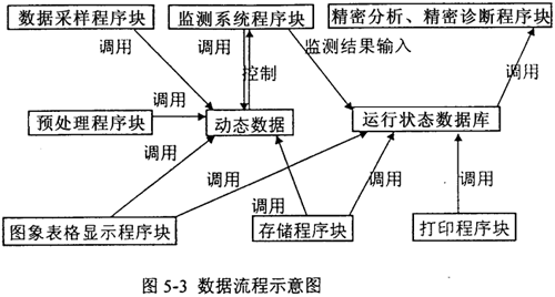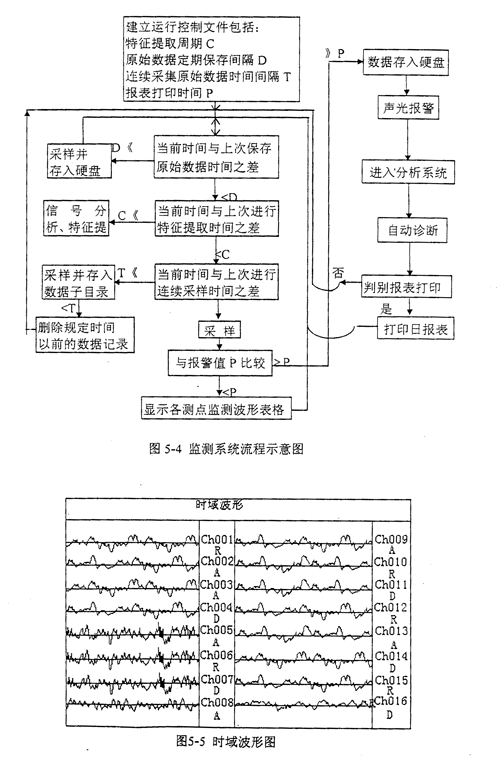 軟件的各個模塊通過動態(tài)數(shù)據(jù)和運(yùn)行狀態(tài)數(shù)據(jù)庫聯(lián)系在一起,在下位機(jī)中,監(jiān)測系統(tǒng)控制著動態(tài)數(shù)據(jù)的采集、存儲、顯示和預(yù)處理,同時把監(jiān)測結(jié)果存入各機(jī)組運(yùn)行狀態(tài)特征數(shù)據(jù)庫。在上位機(jī)中,詳細(xì)分析診斷程序塊調(diào)用運(yùn)行狀態(tài)數(shù)據(jù)庫,得出診斷結(jié)果并調(diào)用打印程序塊輸出。圖5-3為數(shù)據(jù)流程示意圖,圖5-4為監(jiān)測系統(tǒng)流程示意圖。