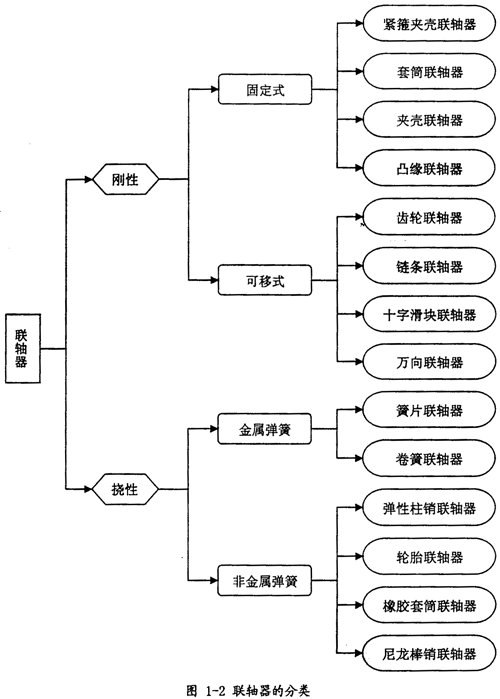 就聯(lián)軸器種類而言,若按補償兩軸相對位移能力的不同可分為:剛性聯(lián)軸器和撓性聯(lián)軸器;剛性聯(lián)軸器按能否允許兩軸有相對位移又可分為:固定式聯(lián)軸器和可移式聯(lián)軸器;撓性聯(lián)軸器按其彈性元件的不同可分為金屬彈簧聯(lián)軸器和非金屬彈簧聯(lián)軸器;若按結(jié)構(gòu)可分為套筒聯(lián)軸器、鏈條聯(lián)軸器、輪胎聯(lián)軸器等等。其總的分類圖如圖1-2所示。