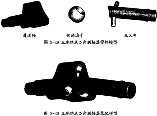 三球銷式萬向聯(lián)軸器是一種被廣泛應用的聯(lián)軸器,已有近30年的歷史,它同后面敘述的兩種聯(lián)軸器同屬三叉式萬向聯(lián)軸器,它們的傳動原理在本文的第三章中有詳細的描述,是一種運動規(guī)律十分復雜的聯(lián)軸器。它的裝配模型和零部件模型分別如圖2-30、圖2-29所示.在聯(lián)軸器轉動時,傳遞滾子既可相對滑道軸中的滑道軸向移動,也可沿三叉桿的軸頸轉動和徑向移動,以補償兩軸夾角的變化。