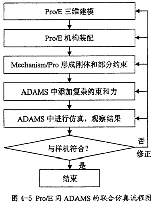 在仿真中如果發(fā)現(xiàn)結果不對,則我們需要對前面的模型進行修正,然后再做仿真分析,直到結果正確�?偠灾肞ro/E和ADAMS進行聯(lián)合仿真,其基本的步驟如圖4-5所示。