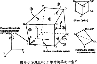 此單元為3-D固體結(jié)構(gòu)單元,由八個(gè)節(jié)點(diǎn)組成,在單元的每一節(jié)點(diǎn)上有三個(gè)自由度,即分別沿著三個(gè)坐標(biāo)軸的方向。此單元可以進(jìn)行塑性、蠕變、應(yīng)力硬化、大變形以及大應(yīng)變分析,是結(jié)構(gòu)分析中的最常用單元。單元結(jié)構(gòu)如圖6-3,此單元有兩種退化形式(見(jiàn)圖6-3右邊)。